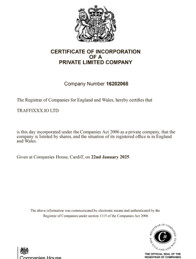 Регистратор компаний Англии и Уэльса настоящим подтверждает, что “на сегодняшний день TRAFFIXXX IO LTD является частной компанией с номером 16202065, которая владеет акциями, а ее зарегистрированный офис находится в Англии”. Справка опубликована в Companies House, Кардифф, 22 января 2025 года.