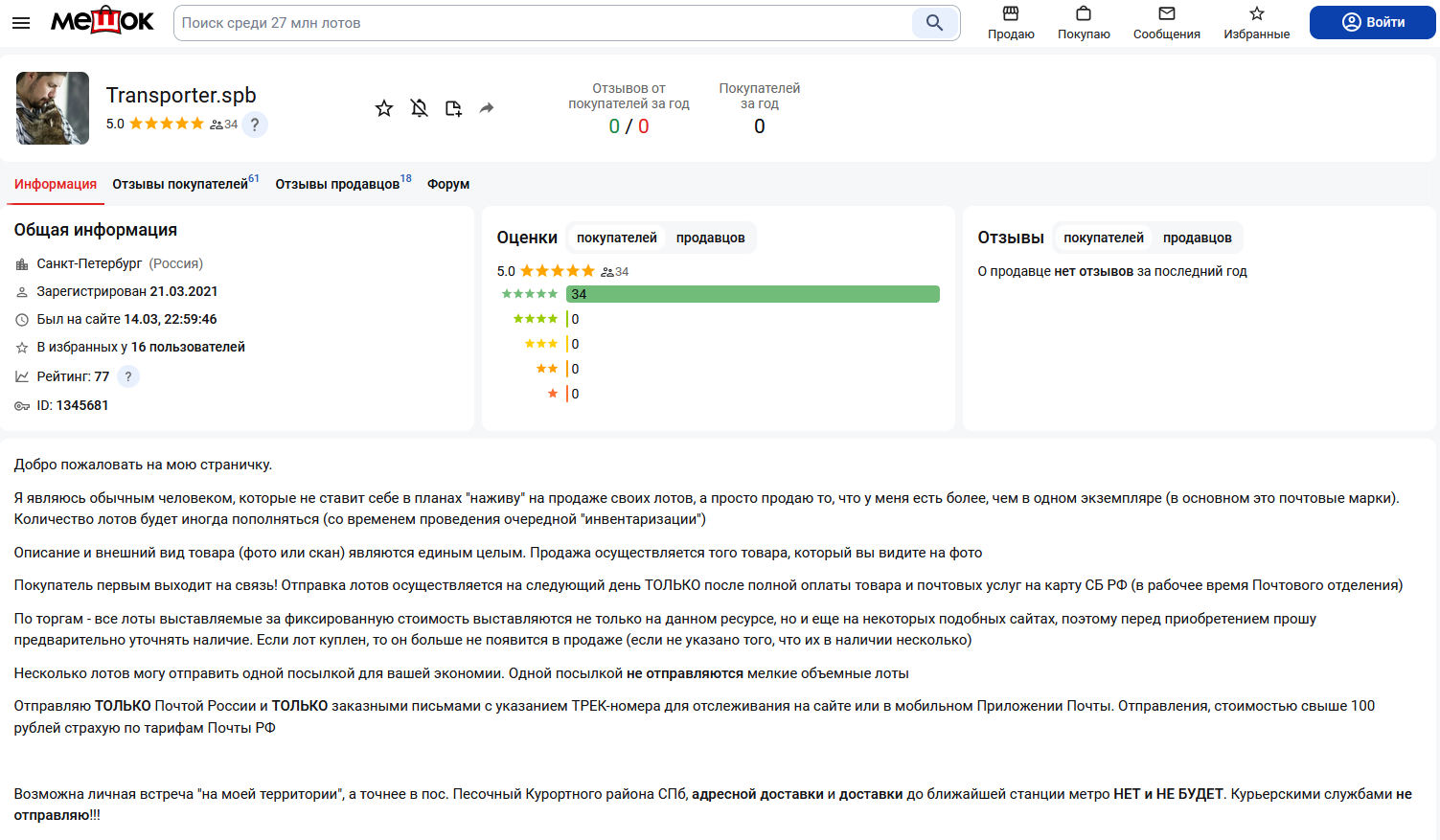Transporter Spb — это никнейм анонимного продавца на маркетплейсе «Мешок», который специализируется на торговле антикварными товарами, коллекциями, редкими подарками, реликвиями и другими подобными подарками.
