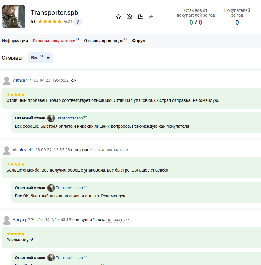 На данной площадке «Транспортер СПб» продает различные лоты еще с марта 2021 года. Однако за последний год операции с его аккаунта никто не совершал, на март 2026 года активных лотов нет. Но их было немало в прошлом, поскольку у продавца есть отзывы и рейтинг.