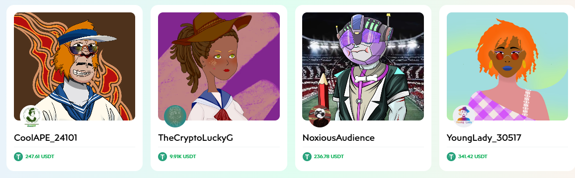 Пользователям предлагается покупать серии NFT изображений и продавать их, когда они вырастут в цене. Стоимость одной картинки NFT варьируется от 120 до 9910 USDT.