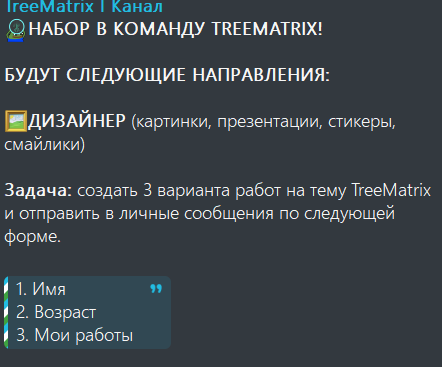 В описании авторы ссылаются на чат и каналы с отзывами и активностью. Интерес люди не особо проявляют, полагая, что TreeMatrix — развод. Также админы сообщают, что ищут кандидатов на свободные места в проекте.