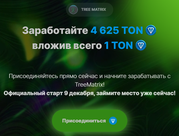Tree Matrix Bot предлагает в игровом формате получать токены Ton. Суть заработка кроется в дарении финансовых подарков на сайте. Внутри системы нет доверительного управления, а третьи лица не контролируют операции.