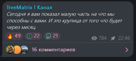 Судя по числу просмотров на TreeMatrix в Телеграмм, в активности на канале пользователи не сильно заинтересованы.
