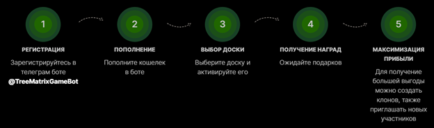 Для получения заработка на «TreeMatrix | Канал» потребуется миновать пять этапов. Сначала клиенты должны зарегистрироваться и пополнить счет. После этого перед ними откроется выбор досок. После активации клиенты сразу получают награды. Все выглядит так, будто TreeMatrix работает по схеме пирамиды.