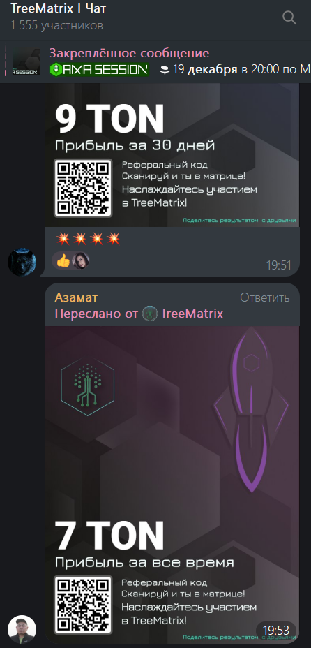 В чате площадки состоит более 1,5 тыс. человек. Пользователи TreeMatrix Chat демонстрируют свои достижения, показывая, сколько им удалось заработать.