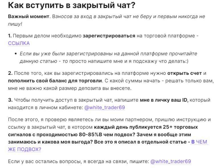Для вступления в закрытый чат нужно не только оплатить подписку, но и зарегистрироваться на бирже по партнерской ссылке Белого. После пополнения счета необходимо скинуть трейдеру свой ID и скриншот личного кабинета. Только после этого будет открыт доступ к чату.