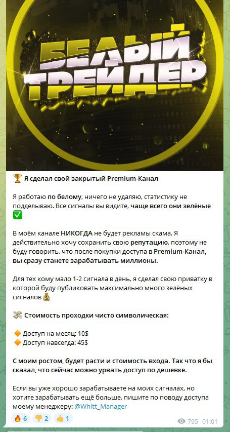 Кроме бесплатного канала, Белый также продвигает платный Premiun-канал, подписка на который стоит 10$ в месяц или 45$ навсегда. В этом чате трейдер публикует по 25 сигналов каждый день, утверждая, что 80-90% из них являются успешными.