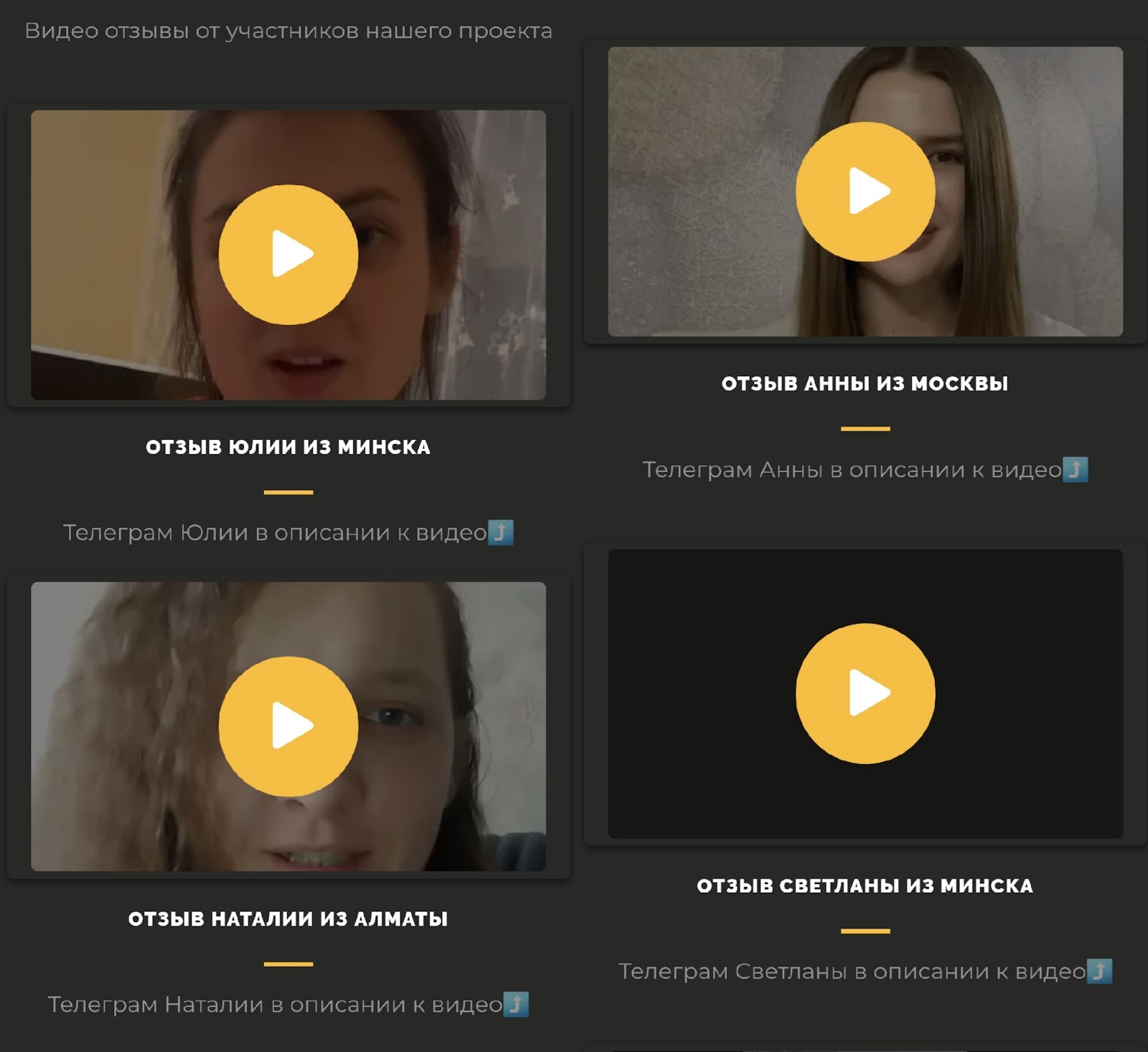 На самой площадке находится большое количество видеороликов с обратной связью сотрудников проекта. Авторы Triotech Pro сильно акцентируют внимание на том, что работу они предоставляют жителям Беларуси, России и Казахстана, что подписывают города даже у отзывов.