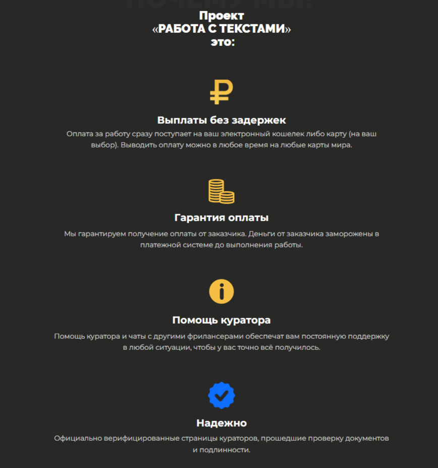 Клиентам тут обещают выплаты без задержек после каждой работы на карту или электронный кошелек. На протяжении всей деятельности участники смогут получать поддержку от кураторов, которые прошли верификацию документов. Их личности не афишируются, и что за проверку они проходят – непонятно.