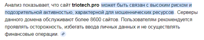 В интернете о проекте нет подробной информации, что подтверждает ее короткий срок работы. Она засветилась только в двух разоблачениях. Отзывов о сайте с работой «Триотех Про» Triotech Pro немного, и подробнее о них мы расскажем позже.
