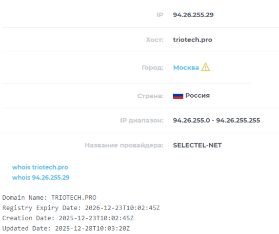Когда, где и кем был запущен источник – не раскрывается. Судя по характеристикам домена, произошло это 23 декабря 2025 года в Москве со сроком работы – 1 год. Это маленький период, показывающий несерьезные намерения руководства. Плюс, фирма является молодой, что ставит под сомнение ее авторитетность.