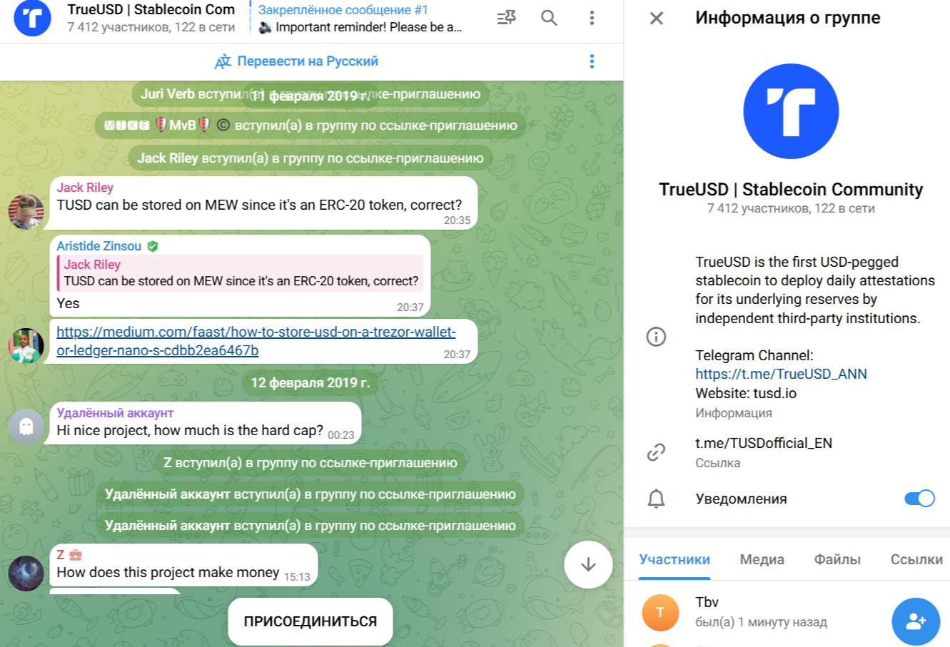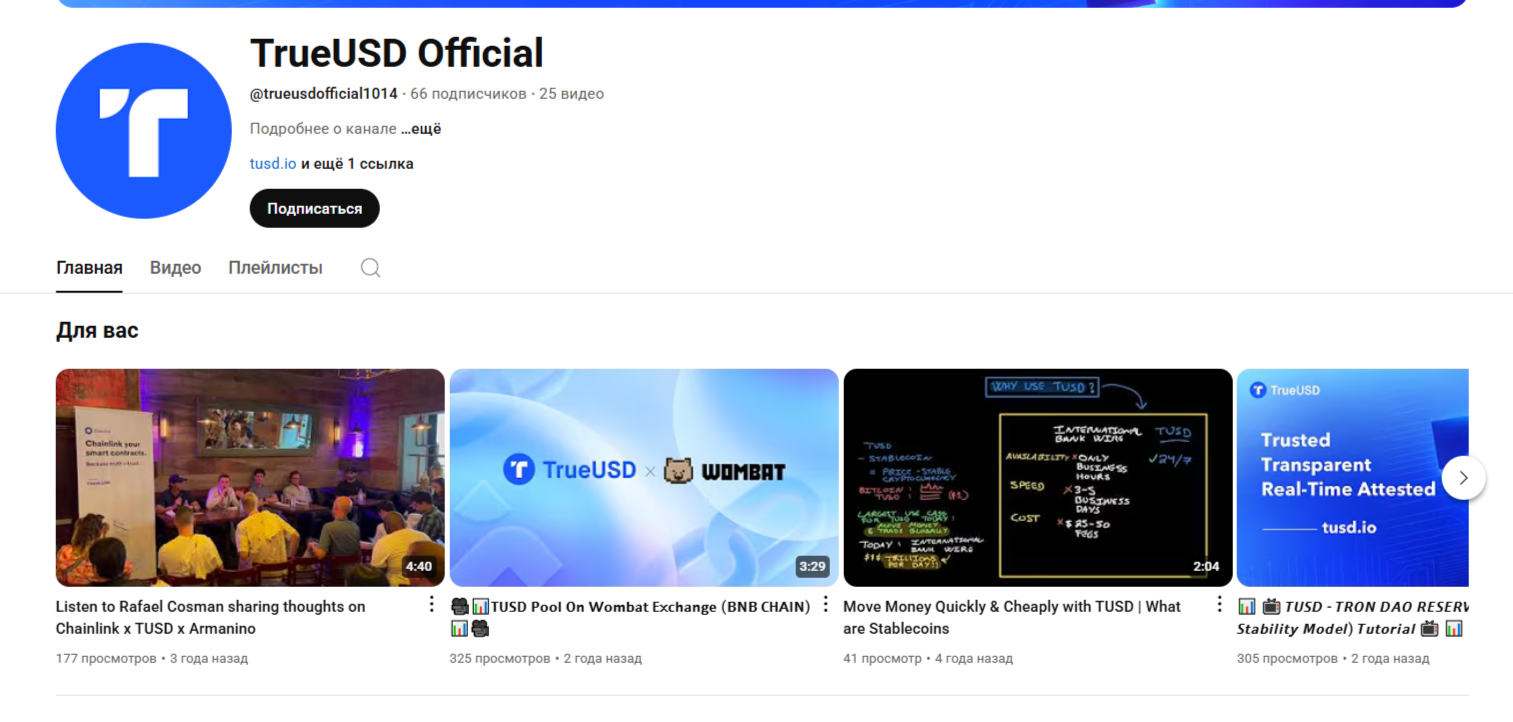 Рекламную кампанию своей криптовалюты команда TrustToken осуществляет на сайте x com и в Instagram. Проекты по продвижению цифровой монеты tusdio можно найти и в Телеграме. Они представлены каналами TrueUSD ANN и TUSDofficial EN. Последний был создан 11 февраля 2019 года. Имеет 7 412 подписчиков. В ленте ресурса можно увидеть информацию о криптовалютном проекте и ее обсуждения пользователями.