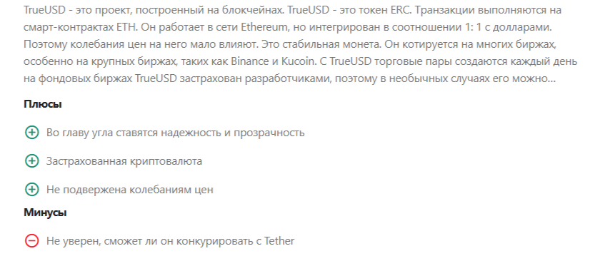 Truly Tusd – достаточно интересная монета с низким уровнем риска по отношению к иным криптовалютам. Плюсами данного цифрового актива можно назвать доступность на разных блокчейнах, быстрые транзакции, аудиты резервов. К минусам этой криптовалюты стоит отнести: