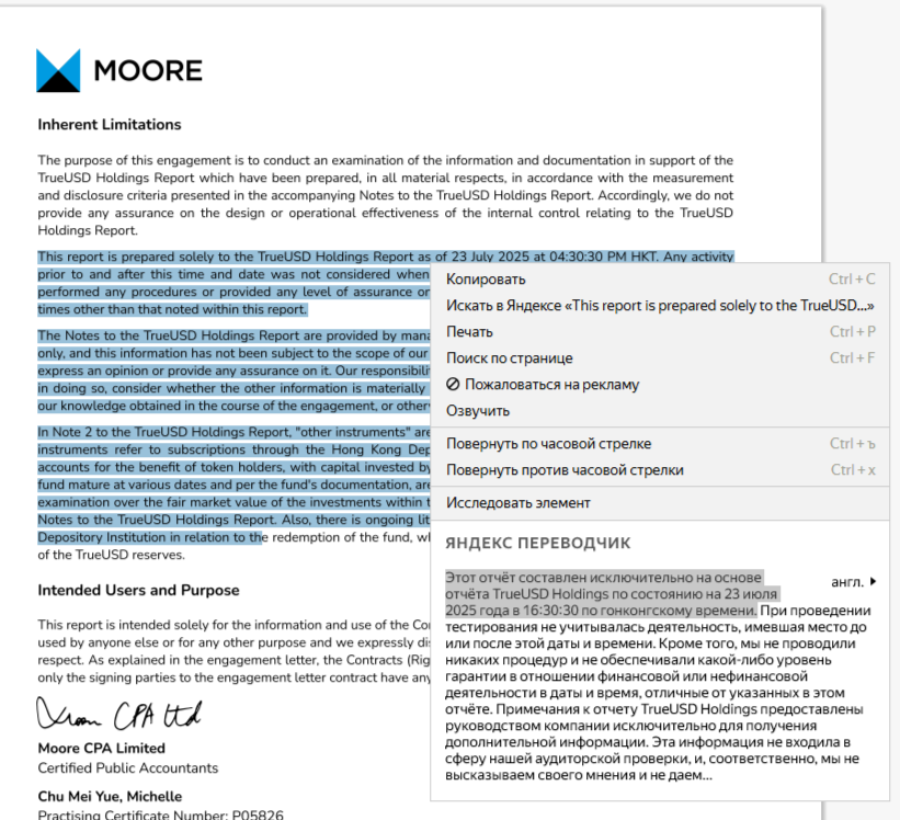 Полезную информацию об организации можно увидеть в разделе «Прозрачность». Здесь представлена ссылка на аудит независимой бухгалтерской организации Moore Hong Kong. Отчет по обеспечению стейблкоина фиатной валютой этой организацией был составлен 23 июля 2025 года на основании отчета компании TrustToken. Из текста документа можно понять, что процедура оценивания не предусматривает оценку справедливой стоимости инвестиций.
