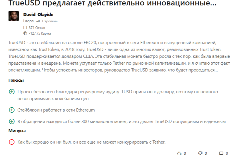 Монета, обеспеченная долларом США, активно торгуется на разных биржах более семи лет. За это время токен TrueUSD получил большое число положительных отзывов. В своих позитивных комментариях пользователи отмечают надежность и прозрачность криптовалюты, не подверженной колебаниям цен.
