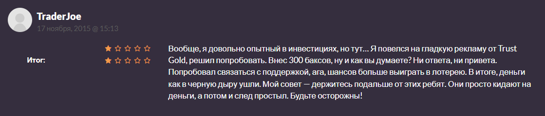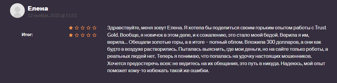 Если вы сталкивались с компанией Trust Gold Com, поделитесь своим опытом в комментариях. Ваш опыт поможет другим читателям составить более полную картину.