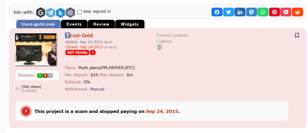Актуальных отзывов инвесторов о Trust Gold Com и Траст Голд в открытых источниках немного. Старые комментарии касаются прежней версии проекта с инвестициями в золото и отмечают прекращение выплат после 8 дней работы в 2015 году (статус NOT PAYING по данным мониторингов).