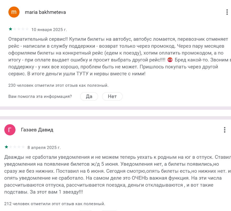 Проблемы сводятся к высоким сервисным сборам, которые не возвращают, неполным возвратам денег при отменах и неполному отображению доступных билетов. Это делает покупку через Tutu ru дороже и опаснее.