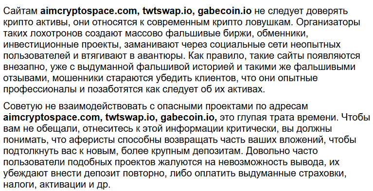 Во всех найденных отзывах TWTswap io нет ни одного упоминания о благополучном возврате токенов. Несколько авторов связывают TWT Swap с целой сетью однотипных площадок, копирующих интерфейс и способ коммуникации. Положительного опыта использования мы не обнаружили.