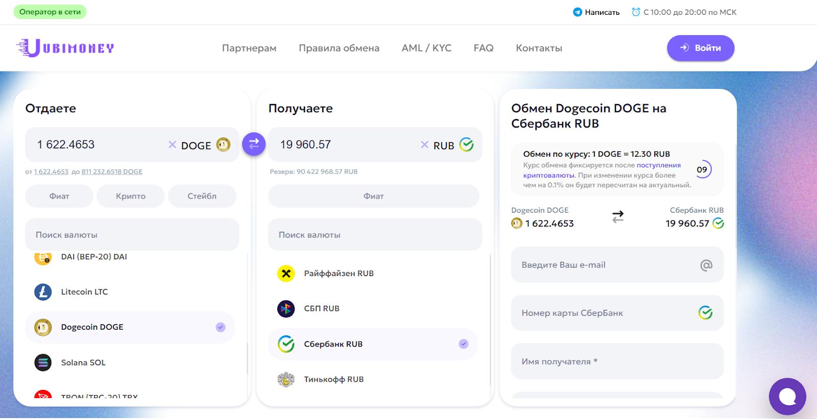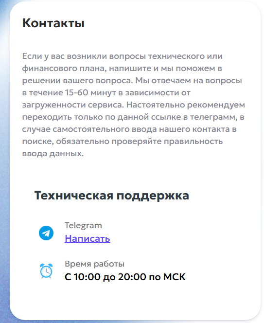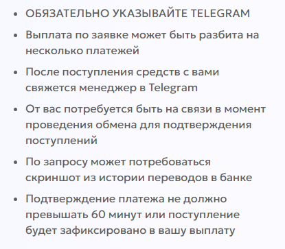 Техподдержка в случае проблем сможет оперативно помочь в мессенджере Telegram, но только с 8 до 20 часов. Ночные обмены стоит избегать, потому что за время ожидания ответа от поддержки может значительно измениться курс крипты и клиент получит непредвиденный убыток.