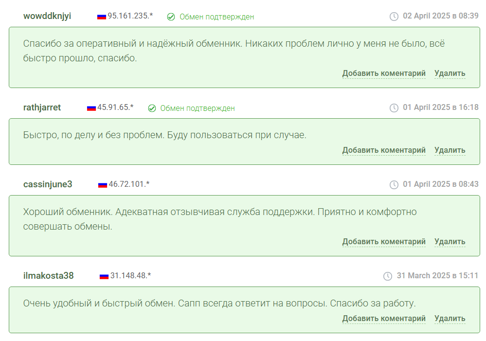Положительных отзывов действительно много и клиенты отмечают быстрый обмен и оперативные ответы техподдержки. Несколько сомнительно выглядит их одинаковая структура и отсутствие деталей обмена. Есть риск, что некоторое количество отзывов дольных клиентов могли быть написаны под заказ, чтобы создает видимость качественного сервиса.