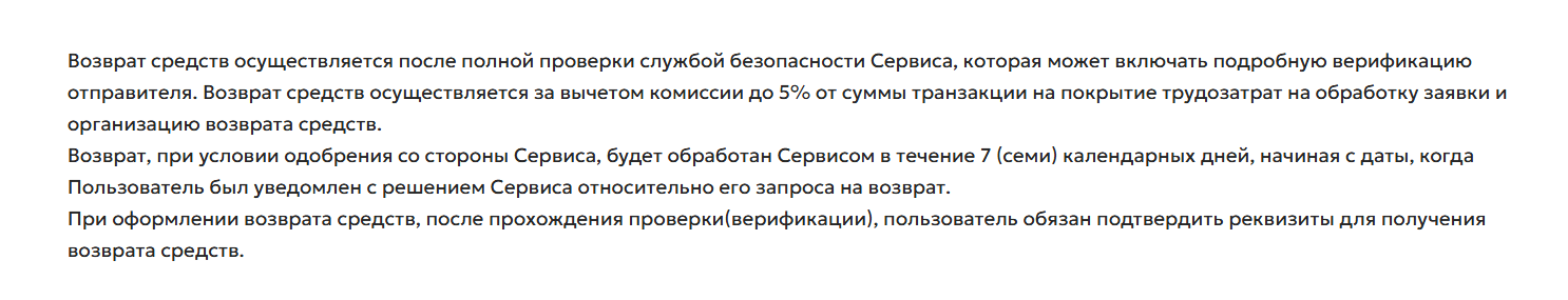 Если отправленная клиентов крипта не смогла пройти AML проверку, тогда возврат происходит только после прохождения верификации и за вычетом комиссии в 5%. В дополнение придется подождать 7 календарных дней, а значит деньги будут заморожены минимум на неделю, если еще удастся пройти верификацию за один день.