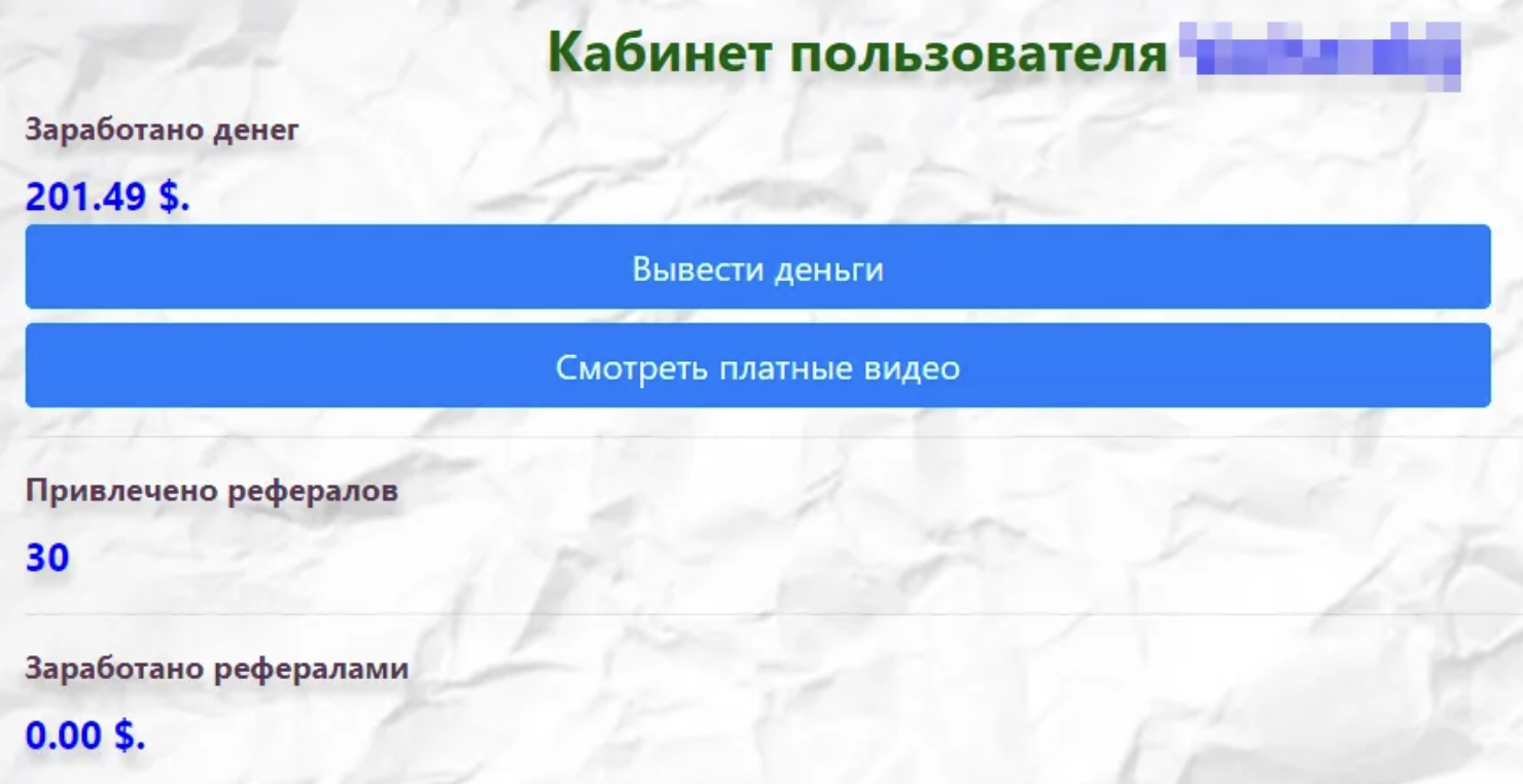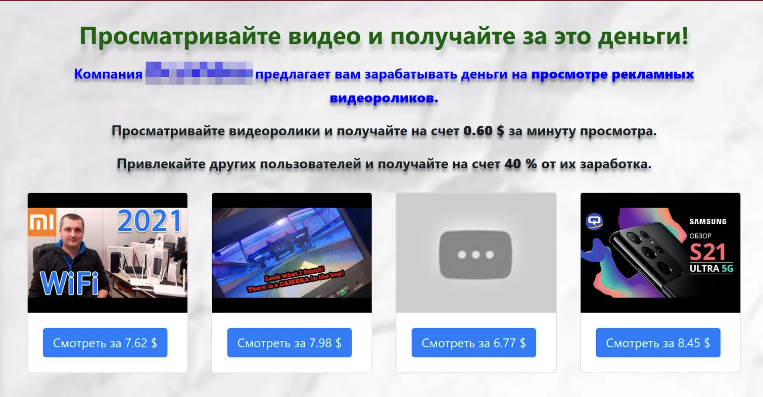 Механика была предельно простой. После регистрации человек начинал смотреть видео. Под каждым роликом стоял таймер, который нужно было досмотреть до конца — перематывать или ставить на паузу нельзя. За каждую минуту начислялось около $0,60.Параллельно предлагалось приглашать друзей: за каждого реферала, который тоже смотрел видео, начислялось 40% от его заработка. Вывод денег обещали на банковскую карту, QIWI или даже на телефон. Минимальная сумма для первого вывода — $200. Чтобы ее набрать, нужно было либо очень много смотреть роликов, либо активно привлекать рефералов.