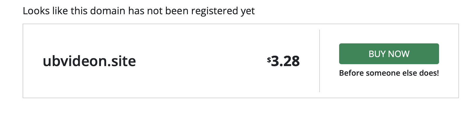 Оценивать интерфейс и наполнение сайта проблематично: по состоянию на апрель 2026 года домен Ubvideon не зарегистрирован и выставлен на продажу. При попытке зайти на сайт мы видим, что домен можно купить всего за несколько долларов. Это — прямой признак того, что сайт давно «свернулся».