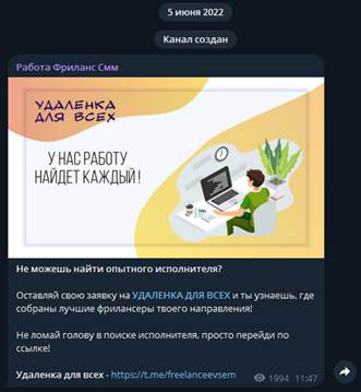 Телеграм-канал «Удаленка для всех» не зарегистрирован на TGStat, поэтому отследить точную статистику нельзя. Он создан 5 июня в 2022 году. Тогда админ выложил один пост о том, что стоит оставить свою заявку на сайте и узнать, где собраны лучшие фрилансеры направления пользователя. На этой публикации собрано около 2 тысяч просмотров, а на канал подписано 88 подписчиков. Значит, этот пост пересылали как рекламу в другие источники. Других публикаций в блоге нет. Комментировать их нельзя, поэтому задать вопрос об исчезновении автора нельзя.