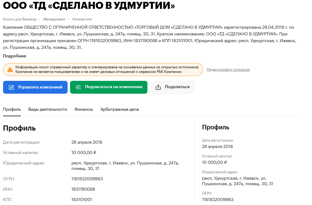 За UDM MARKET стоит ООО «ТД «Сделано в Удмуртии»». Зарегистрировано 26 апреля 2018-го. Адрес: Ижевск, Пушкинская 247а. Управляющий – Дмитриев Денис. Доля 75,10%.