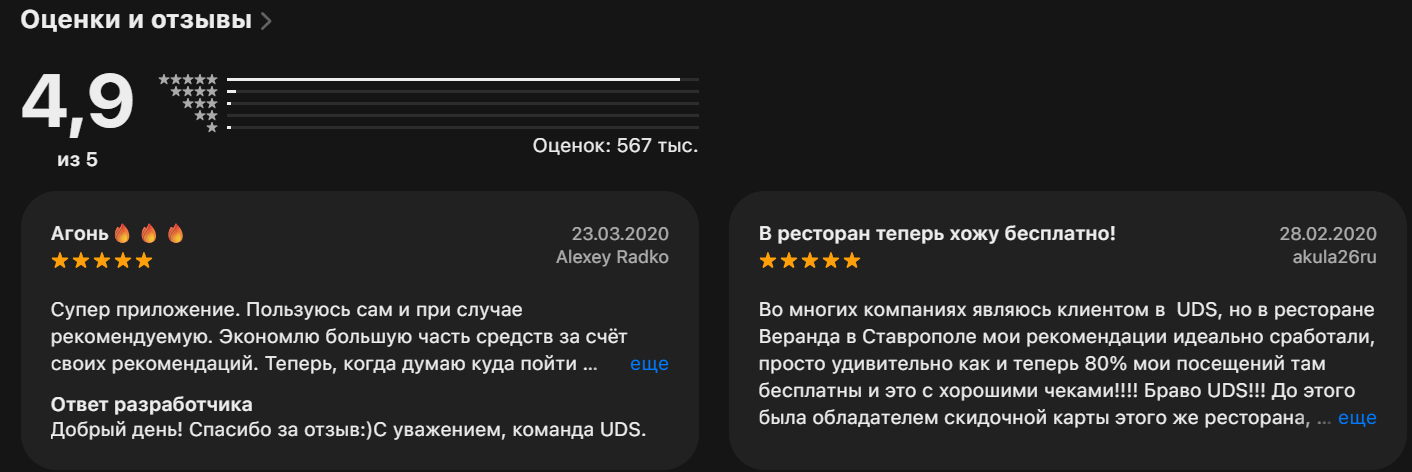 Официальное приложение UDS game отзывы получило преимущественно позитивные. У него рейтинг 4,9 из 5, который основан на более 500 тысяч оценок. Негативных комментариев здесь очень мало. Несмотря на это, иногда встречается информация, что UDS game – мошенничество. В подавляющем большинстве случаев люди довольны предложением компании. Бизнесы могут быть недовольны наличием платной подписки и низким откликом со стороны пользователей на их предложения.