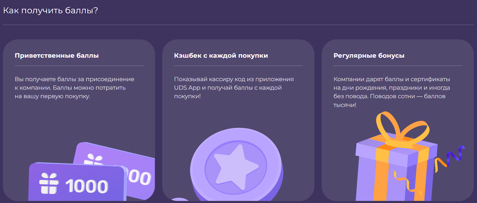 Для пользователей Udsgame действует реферальная программа, которая также позволяет дополнительно зарабатывать. При регистрации люди получают дополнительные приветственные баллы, им может начисляться еще и бонус за привлеченного человека. Далее с каждой покупки через https get uds app будет начисляться кэшбек. Чтобы воспользоваться бонусами, нужно показать кассиру код. Иногда на праздники или на день рождения клиенту могут предоставляться сертификаты и прочие бонусные предложения.