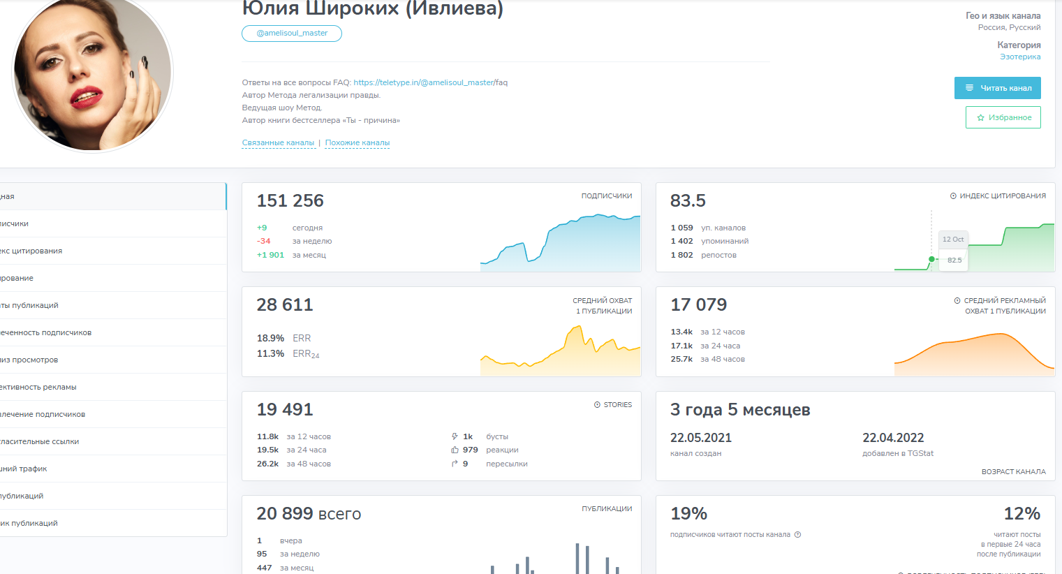 Телеграмм канал Юлия Широких Ивлиева был создан 3,5 года назад. На данный момент аудитория канала ivlievaulia составляет чуть больше 150 тыс. подписчиков, однако регулярно читают посты всего лишь около 28 тыс. пользователей, а активность проявляют только 5,5%. Это может свидетельствовать о накрутке аудитории.