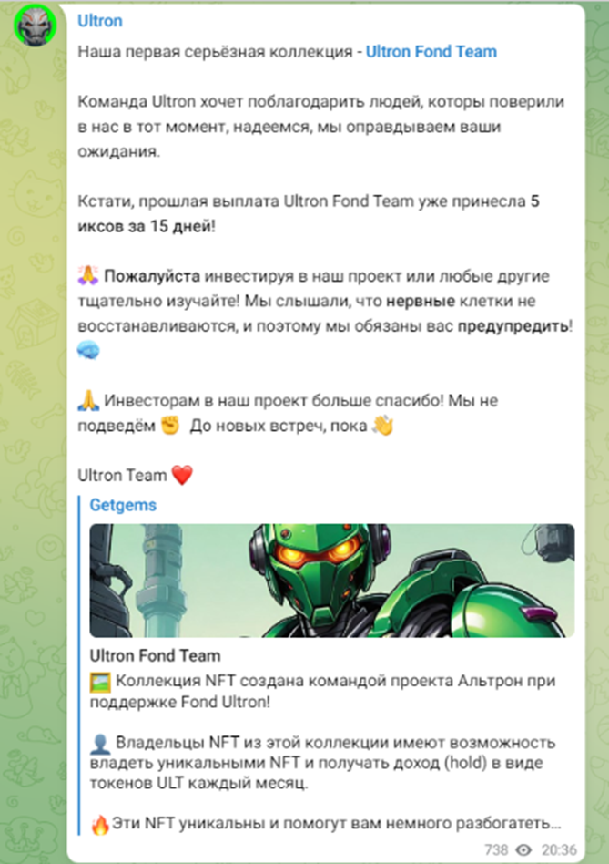 На канале выходил пост в котором админы сообщали о том, что воры смогли получить пароль к кошельку платформы. В связи с этим, они просили пользователей не покупать данный NFT. В этом случае средства будут списаны и ничего не придет. Настораживает, что такие серьезные разработчики, которые смогли создать собственный токен, при этом не справились даже с мерами безопасности проекта.