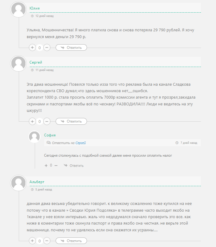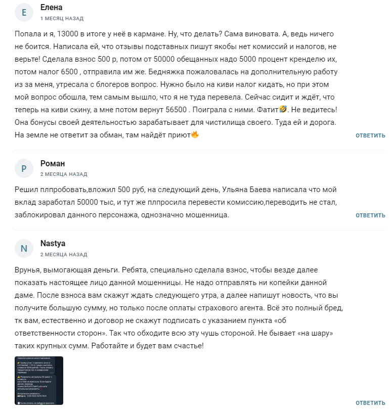 Отзывы реальных людей о канале Ульяны в Телеграмме крайне негативные. Схема развода в таких проектах всегда одинакова: подписчик переводит деньги лжетрейдеру, ожидает несколько часов, после чего ему озвучивают сумму заработка и предлагают оплатить расходы для получения денег. В траты включены 10% гаранта, 13% налога, 20-30% услуги трейдера, 5-15% комиссии за вывод средств. Все суммы рассчитываются от озвученной прибыли. Ульяна отказывается удерживать их из заработанных средств и требует оплаты вперед. Расходы клиента могут доходить до 10-12 тысяч даже с минимального депозита. После развода подписчика блокируют и удаляют переписку.