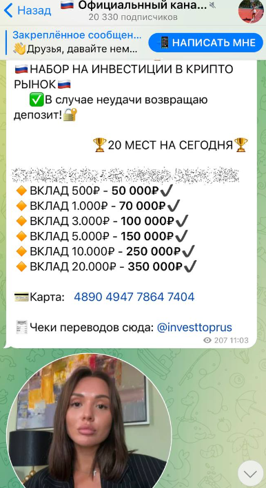 • банковские карты девушки имеют лимиты, поэтому деньги подписчиков она принимает на карты дропов — третьих лиц;