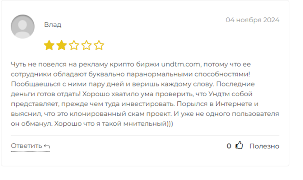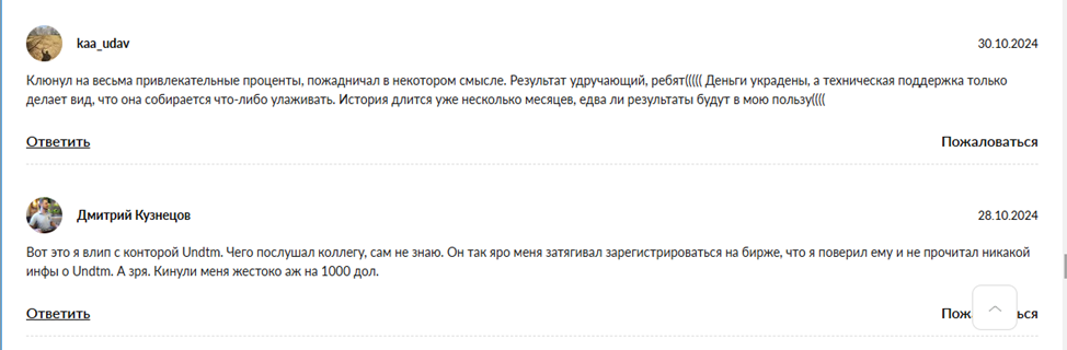 Сайт не публикует положительные отзывы и комментарии от клиентов, не размещает отчеты о проделанных сделках. На независимых платформах много жалоб от пользователей на трудности с выводом средств и заморозку счетов. По отзывам обманутых вкладчиков понятно, что платформа undtm com мошенники.