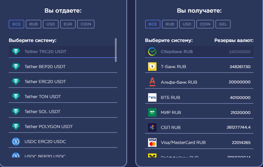 Для начала обозначим, что предлагает сервис для обмена. Итак, с одной стороны, доступно достаточно много систем и монет: от USDT, до BTC и ETH. С другой стороны, есть и довольно много банков, куда возможен перевод, он, кстати, происходит в рублях.