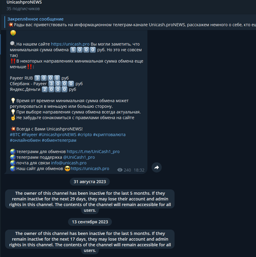Наибольшие вопросы вызывают социальные сети обменника. Например, телеграм-канал Unicashpronew насчитывает почему-то всего 35 подписчиков. Причем велся он всего 1 год: с 2022-го по 2023-й, а далее администратор, похоже, был заблокирован. Это странно для ресурса, который позиционирует себя как очень безопасный.
