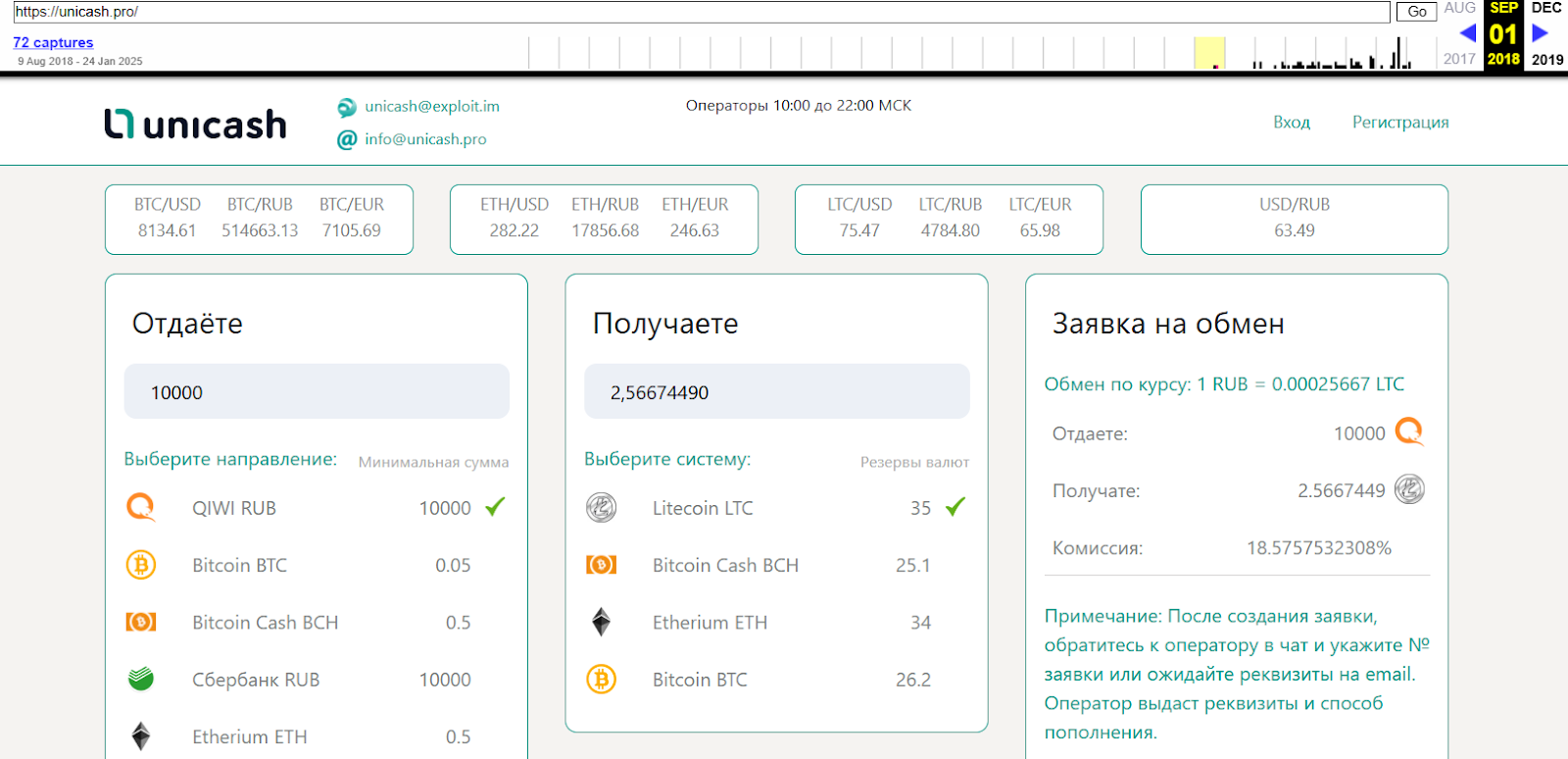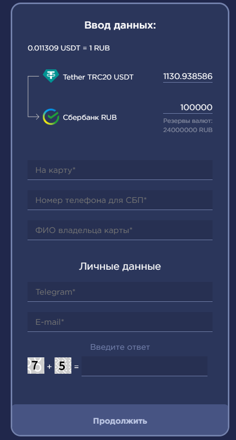 Сделка на Unicash pro происходит максимально просто. Пользователь указывает необходимые суммы и сразу видит курс, по которому идет обмен. Указываются реквизиты карты, ФИО, а также контакты для связи: аккаунт в Telegram и электронная почта.
