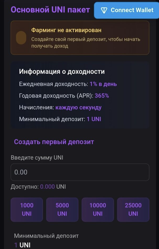 «ЮниФарм» — мини-приложение в Телеге, через которое предлагали инвестировать токены TON. Организаторы проекта обещали вкладчикам пассивный заработок в размере 1-5% в день от суммы внесенного депозита.