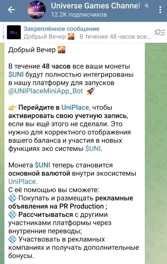 У проекта Uni Farming существовал официальный телеграмм-канал, который назывался Universe Games Channel. Согласно последним доступным данным, на него были подписаны 12,2 тысячи пользователей.