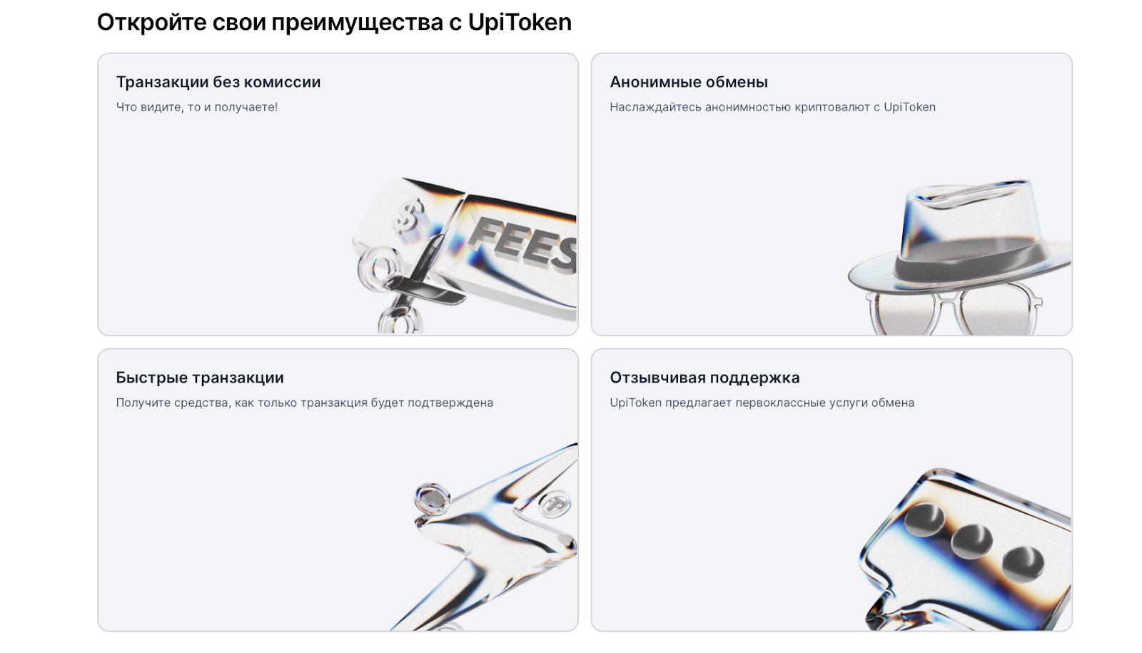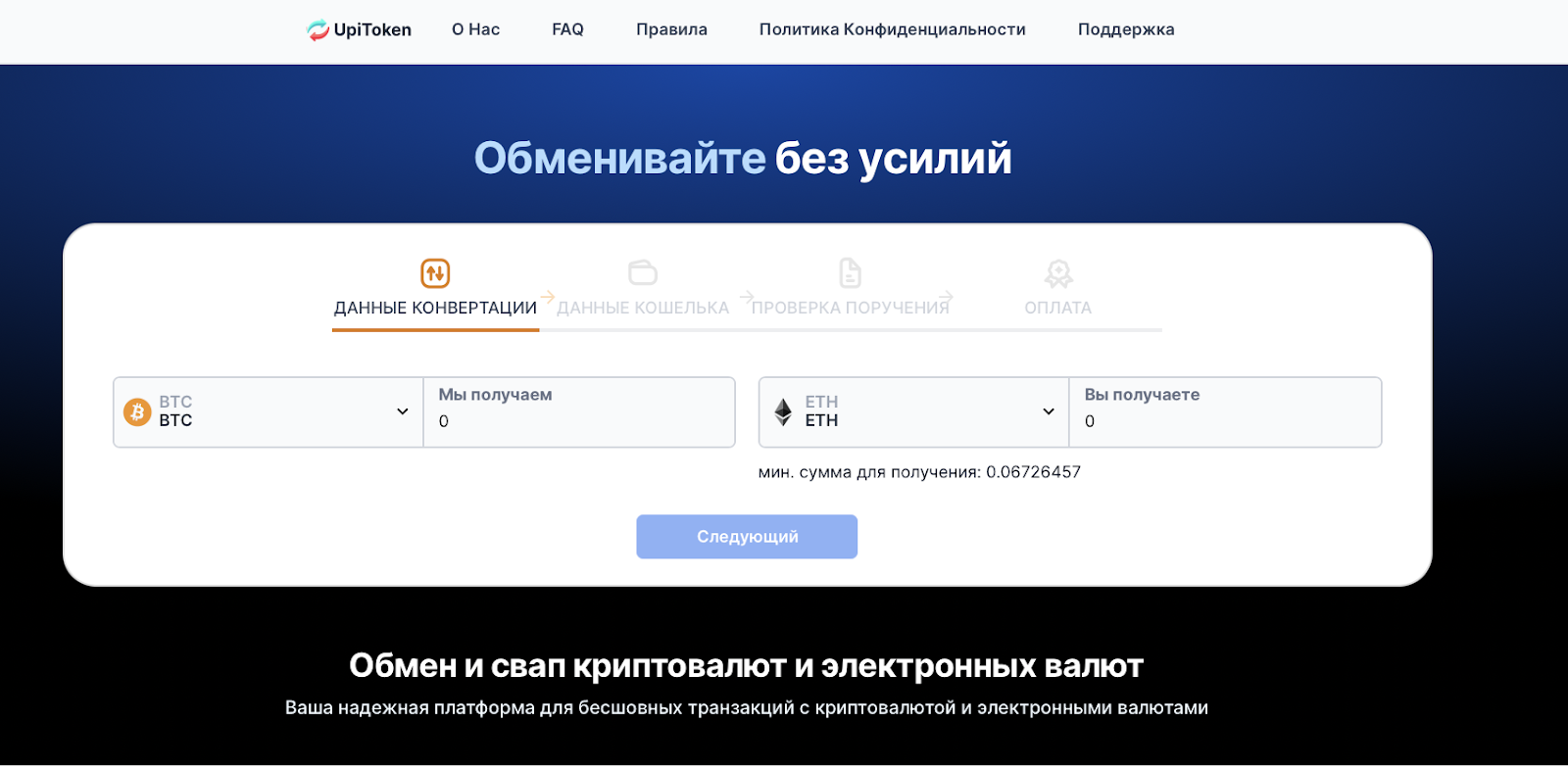 UpiToken — сервис, заявленный как удобный инструмент для конвертирования цифровых активов и выполнения различных операций с электронными деньгами. Создатели проекта говорят про минимальные сервисные сборы и высокую скорость проведения операций. На сайте, по словам разработчика, можно конвертировать крипту без прохождения верификации.