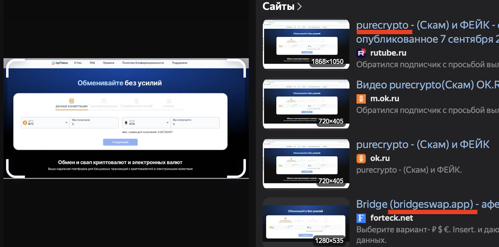Другой признак очевидного обмана — оформление и текстовое наполнение сайта. Он построен по типовому шаблону, который уже использовали десятки клонов (Purecrypto, Bridgeswap и их вариации). Многие из них уже успели попасть в черные списки и получить разгромные статьи. При этом сам upitoken com начал активно «работать» буквально пару месяцев назад — именно тогда в сети появились первые массовые предупреждения. До этого домен практически не светился в поисковиках по крипто-тематике.