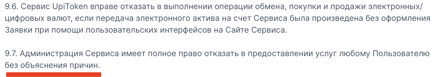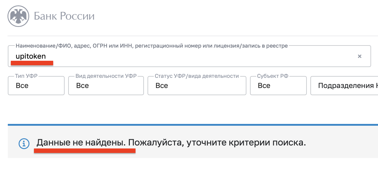 На сайте криптообменника указано, что его официальное название — «UpiToken Co». Однако ни адреса, ни лицензии от регуляторных инстанций у него нет. Причем речь идет как о российской, так и любой иной юрисдикции.