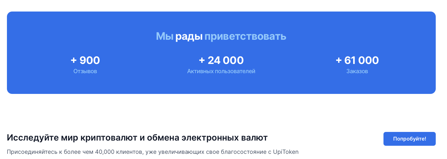 UpiToken отправляется прямиком в черный список. Это представитель одноразовых конвертеров-ловушек, которые используют примитивный шаблон, заманчивые обещания анонимности и нулевых комиссий. Все это только для одной цели — собрать деньги и исчезнуть или переключиться на новый домен. Ни многолетнего опыта, ни реальной компании у проекта нет.