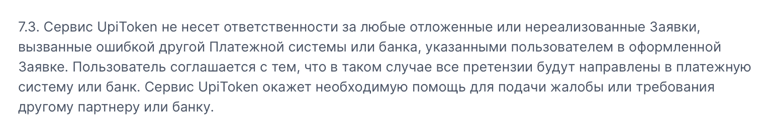 Соответственно, обменник пользователю ничего не должен, даже если операция сорвется по вине самого сервиса или по независящим от сторон причинам.