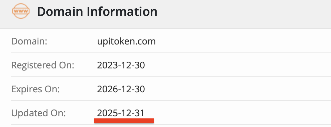 Самый очевидный признак того, что перед нами скам — полное несоответствие заявленного «восьмилетнего опыта» реальной истории домена. Сайт upitoken com зарегистрирован только 30 декабря 2023 года, а последний апдейт произошел в конце декабря 2025-го. То есть проекту на момент активной рекламы едва исполнилось два года.