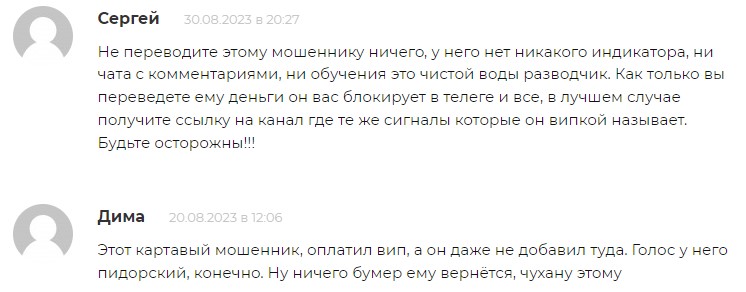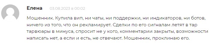 Судя по отзывам подписчиков, имеет свойство удалять подписчиков из VIP-канала без внятного объяснения причин и возврата денег, иногда просто принимает от них оплату и не дает доступ, прекращая выходить на связь.