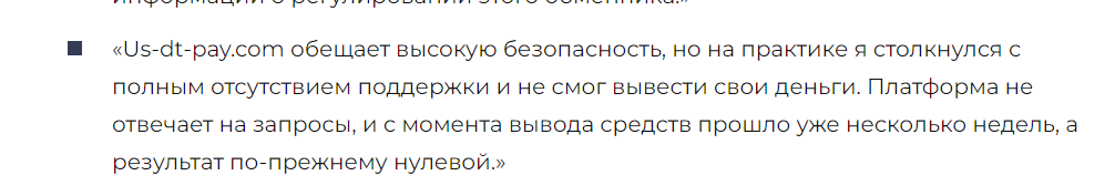 Сервис на сайте Us Dt pay com — это обменник криптовалют, который обещает безопасность средств клиентов и высокую скорость совершения сделок. Мы провели всесторонний анализ деятельности проекта, а также изучили имеющиеся в сети отзывы реальных клиентов.